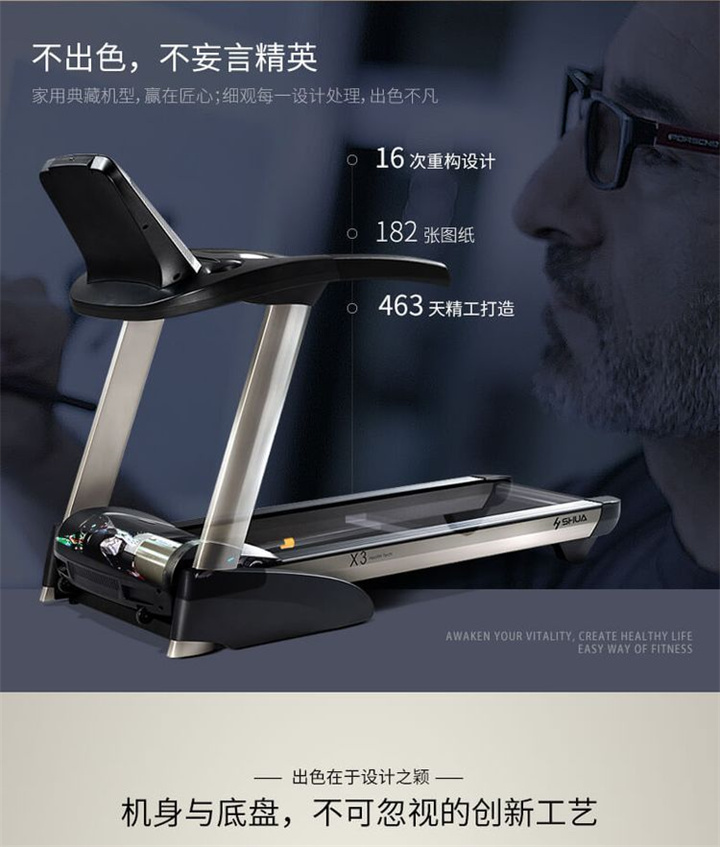 舒华家用跑步机SH-T6700(X6)采用18T+12T双层跑板,T2.2mm钻石纹的跑带,双层跑板全跑台减震,对您跑步中的膝盖进行全方位的呵护,选用接触式心率感应和无线心率感应等多种方式获取数据,跑步面积达520×1450mm,可承受130kg的使用者使用。