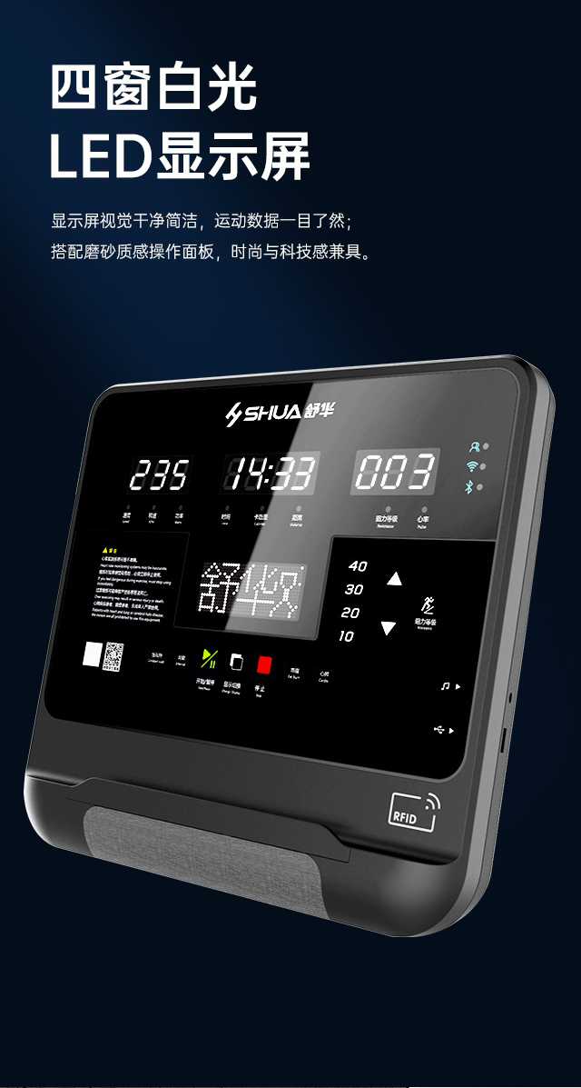 舒华高端跑步机SH-T9100T(V10+)拥有超大高清32寸10点触控晶屏的工业屏,具有扫码、刷卡、人脸识别等多种智能登录方式,方便快捷,并且有在线教学、专业健身模式随意切换,让您开启科学健身。