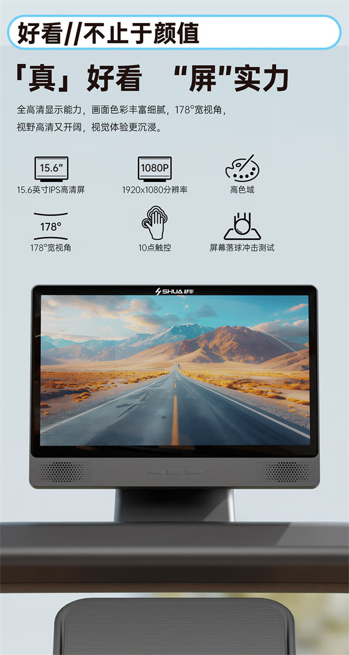 巅峰国际推荐健身器材-舒华商用电动跑步机SH-T6500拥有10.1寸IPS高清触摸屏、Z型动感时尚外观设计、70×150mm精钢立柱机身、F级高效静音马达、520mm商用豪华跑带和35mm双层全跑台减震跑板等优势,让您享受科学跑步。